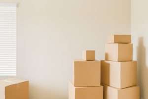 Variety of Packed Moving Boxes In Empty Room with Room For Text.